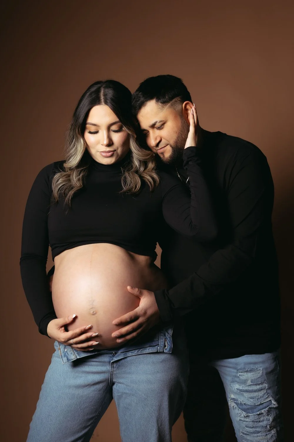 With clean studio backdrops, curated professional lighting, and expert guidance, we highlight the tender details, your smile, your hands resting gently on your bump, the quiet moments of anticipation, and even the laughter you share with your partner. Every session is crafted to reflect your unique journey, whether you envision timeless solo maternity portraits, romantic images with your partner, or lifestyle-inspired shots that capture the everyday magic of preparing to welcome your little one.